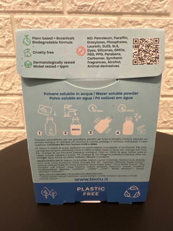 Shampoo in polvere solubile per ricaricare il proprio flacone con soli 250 ml di acqua in modo completamente ecologico.